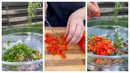 Când toate ingredientele sunt pregătite, iar vinetele și ardeii au început să se coacă pe grătar, aceasta începe prin a toca o ceapă roșie, alături de trei căței de usturoi pe care îi pune într-un bol, ardeiul iute din care scoate semințele, pe care îl taie și îl pune peste amestecul deja făcut. Adaugă și o legătură de pătrunjel verde proaspăt, împreună cu o roșie tăiată cubulețe, apoi ardeiul gras de pe grătar, tocate mărunt, după care vine peste întreaga compoziție.