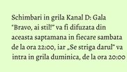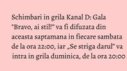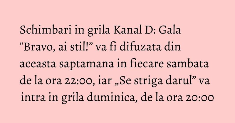 Din 5 noiembrie, Galele eliminatorii „Bravo, ai stil!” vor fi difuzate in fiecare sambata de la ora 22:00, urmand ca duminica, de la ora 20:00, sa intre in grila show-ul „Se