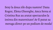 Elena Gheorghe, Cristina Rus, Anca Serea si Dana Rogoz sunt doar cateva dintre divele mioritice care pareau apte pentru catwalk imediat dupa ce au nascut. Pe langa aspectul fizic care a generat complimente pe banda rulanta, la iesirea din maternitate, mamicile au uimit si cu energia debordanta si tinutele atipice in contextul respectiv.