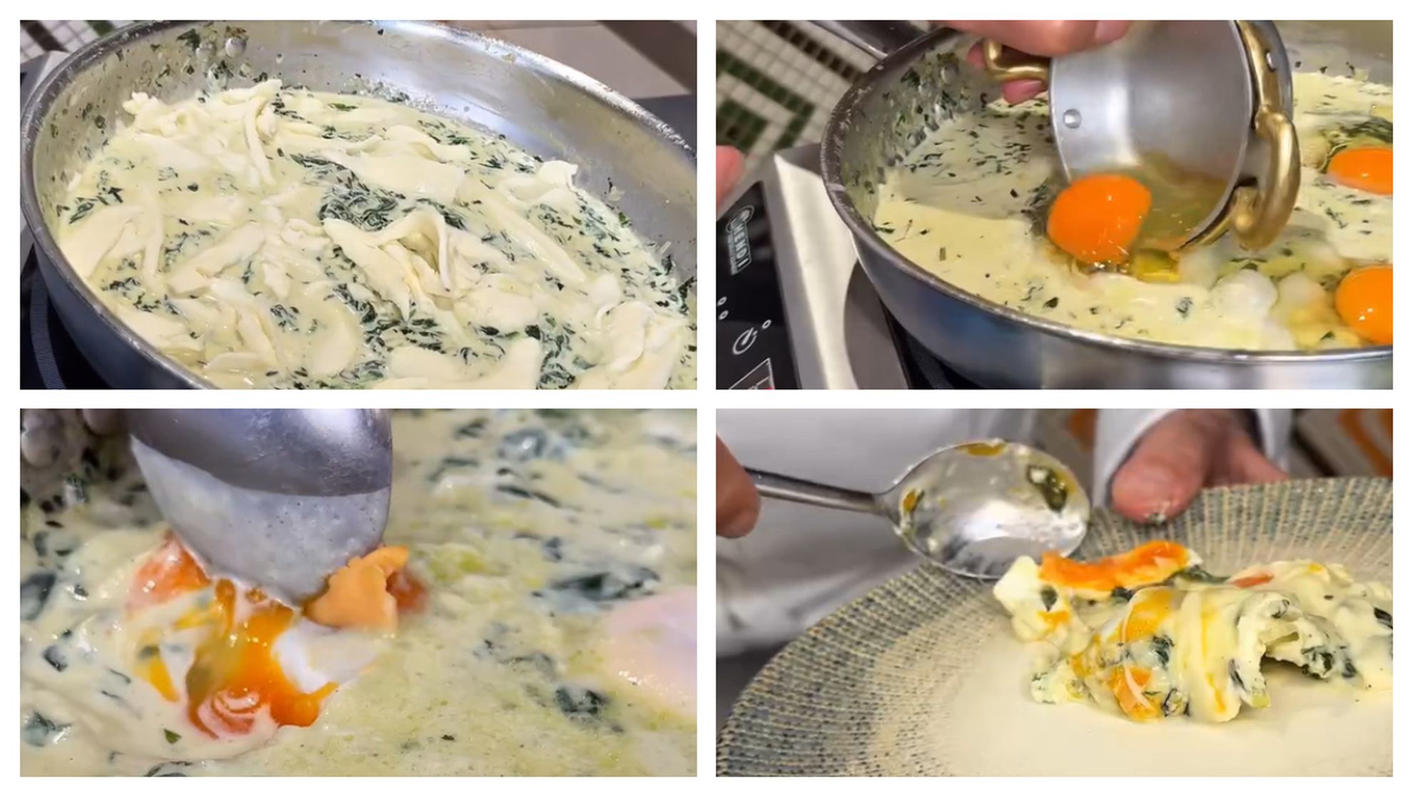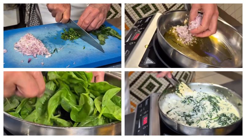„Gătiți ceapă și usturoiul până când ceapa este translucidă. Adăugați pătrunjelul și busuiocul, gătiți puțin până când iese aroma. Puneți spanacul, gătiți până când scade și are zeama. Puneți smântână lichidă și gătiți pentru 5 minute. Asezonați cu sare și piper. Puneți mozzarella și gătiți 1 minut. Puneți ouăle și gătiți fără capac 2 minute. Acoperiți și mai lăsați la gătit încă aprox. 4 minute, cât să rămână gălbenușurile moi. Serviți imediat. Poftă bună!”, a explicat chef Joseph Hadad.