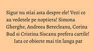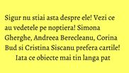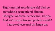 “De Kindle-ul primit de la sotul meu nu ma despart niciodata seara de 4 ani incoace. Pe el citesc acum Orele lui Michael Cunningham. In fotografie sunt alaturi de sotul meu pe strazile Dubrovnicului. Apoi, o vioara de cristal primita in liceu, o floricica facuta zilele trecute de fiul meu, Ianis, pe care scrie "Mulţumesc, familie, pentru iubire!":) Noapte buna!”, ne-a spus Andreea.