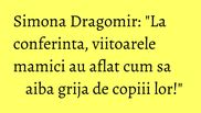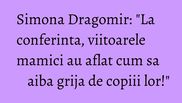 "Sunt onorata ca si de aceasta data am avut invitati specialisti alaturi de care am putut crea o atmosfera calda, familiala pentru viitoarele mame. Conferintele «Traieste sanatos cu Simona» sunt concepute pentru a raspunde direct nevoilor participantilor. Reprezentantii bancii de celule stem Biogenis, MedLife, Silhouette Beauty Centers, Danonino si Magiunul de Topoloveni au venit in intampinarea femeilor insarcinate cu raspunsuri la toate situatiile intalnite in cele noua luni de sarcina", a marturisit realizatoarea emisiunilor "Buna dimineata, Sanatate!" de la Antena 1 si "Traieste sanatos cu Simona" de la radio Itsy Bitsy.