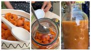 “Fac siropul de caise, un sirop fără fierbere. 1 kg și jumătate de caise punem într-un borcan cu 3 l de apă. La 1 l de apă, jumătate de kilogram de caise. Desfacem borcanul și punem caisele.