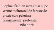 Sophia, considerata una dintre cele mai cool prezente din peisajul muzical romanesc, atrage de fiecare data atentia cu tinutele sale, atat la evenimentele mondene, cat si in viata de zi cu zi. Inclusiv pe timp de ploaie artista face senzatie cu o pelerina transparenta foarte cool.