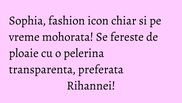 " Mi s-a parut interesanta ideea de transforma pelerina clasica de ploaie intr-o piesa high fashion. Este ideala sa o porti pe vremea asta ploioasa. Este practica si foarte cool", declara Sophia.
