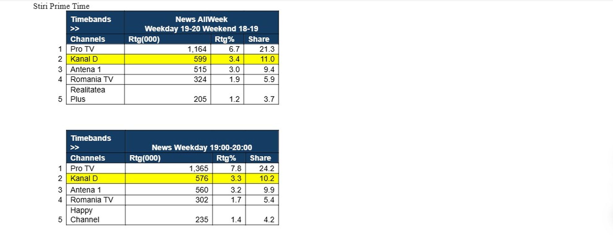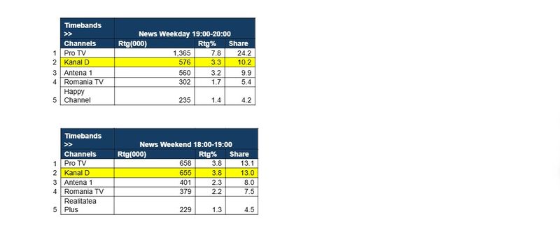 opţiune importantă pentru telespectatorii din România. Pe parcursul anului recent încheiat, Știrile Kanal D din Prime Time au înregistrat o cotă de piață de 11,0%, cu o medie de 599.000 de telespectatori pentru fiecare ediție, pe tot parcursul săptămânii. De luni pana vineri, de la 19:00, Stirile Kanal D au cumulat o cota de piata de 10,2% si 3,3% Rating, iar in weekend, in intervalul 18:00-19:00, 13,0% cota de piata, cu 3,8% Rating, la foarte mică distanţă de primul clasat.Prin profesionalism, relevanță și echidistanță editorială, echipa Știrilor Kanal D continuă să ofere publicului informații esențiale de pe agenda publică și să își consolideze poziția in topul preferintelor publicului, pe tronsoane strategice ale consumului de televiziune din România.