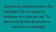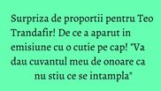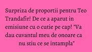 Cand surpriza a fost dezvaluita, Teo s-a emotionat pana la lacrimi. "Sunt onorata de tot ce vad. Cu toti cei prezenti aici in platou am cate o legatura! Aoleu, imi tremura chiloteii pe mine! Vai, imi tremura mainile rau! Cum sa tin tortul, fratilor?", a adaugat Teo Trandafir.