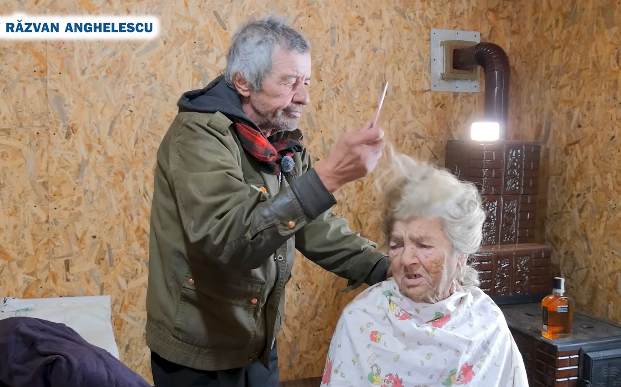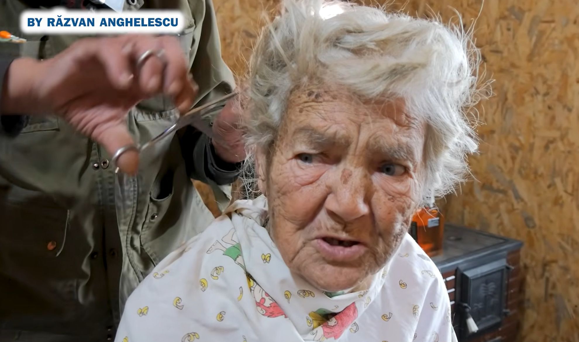 Tanti Vasilica: Domnule, după piele să mă tundeți, că îmi crește repede, dă-l încolo. Așa tataie, taie. Câți ani aveți? Eu am 90, matale câți ai?