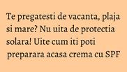 Pe cat sunt de placute pe atat de periculoase sunt razele soarelui. Daca iti faci bagajul pentru vacanta trebuie sa iei cu tine si crema cu factor de protectie. Daca esti adepta produselor naturale homemade prepara-ti singura lotiunea care te va proteja in acesta vara!