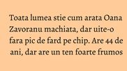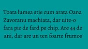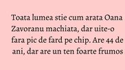Nu este insa si cazul Oanei Zavoranu (44 ani) care arata foarte bine si nemachiata. Vedeta isi face des tratamente faciale la clinica ei, inaugurata in urma cu aproape un an, iar rezultatele sunt vizibile.