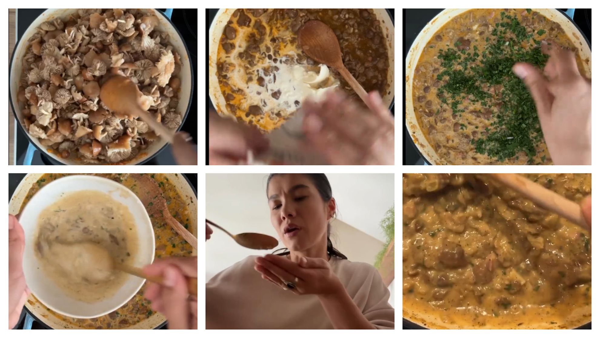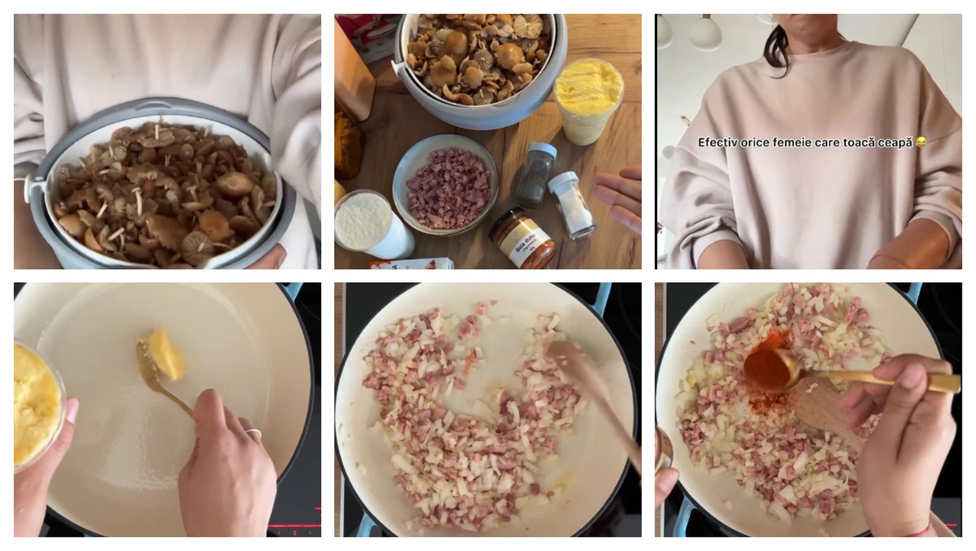 „Aici am pregătit toate ingredientele. Am pus o lingură de unt într-o oală de fontă, după care am adăugat bacon, ceapă și boia dulce. Am amestecat două minute, după care am adăugat bureții, peste care am pus sare și piper. Am lăsat totul la fiert pentru 20 de minute, după care am luat capacul și am pus usturoiul, smântâna lichidă și puțin iaurt de oaie. Am pus pătrunjelul și mi-am dat seama că rămăsese destul de lichidă, așa că am amestecat puțină făină și compoziție să o îngroș.