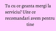 Geanta cu care mergi la munca trebuie sa fie destul de mare incat sa iti incapa in ea cam tot ce ai de luat cu tine peste zi. Trebuie sa fie insa si practica si cool, sa se asorteze cu tinutele pe care le abordezi si cel mai important, sa fie de calitate pentru ca este cea mai purtata geanta a ta.