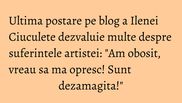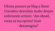 Chiar daca nu multe persoane stiau de existenta lui, Ileana Ciuculete – artista rapusa la 65 de ani de o boala crunta- a avut si un blog, pe care mai scria din cand in cand despre intamplarile prin care a trecut. Ultima postare a interpretei, care dateaza din 21 octombrie 2015, data dupa care Ileana nu a mai scris nimic pe site-ul ei, cuprinde cateva dezamagiri profunde ale vedetei, legate in principal de actele de caritate la care a participat.