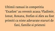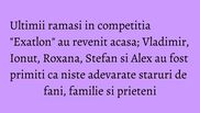 "Chiar daca am stat cinci luni in Republica Dominicana, cand vad toate chipurile aceastea am senzatia ca am fost plecat doar o saptamana. Vad toata bucuria din ochii lor... <Exatlonul> a ramas acum in imagini, restul e in sufletul nostru. Va multumim ca ne-ati sustinut", a spus Alex.