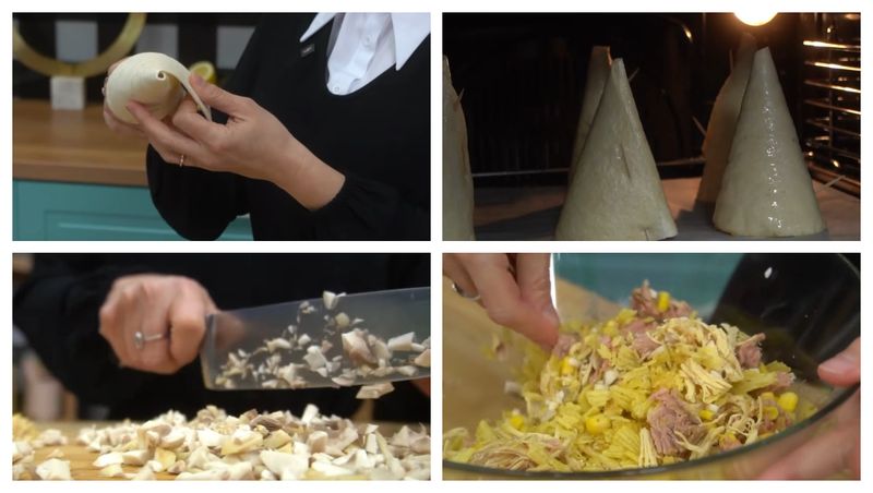 Ele se adaugă zdrobite, însă abia înainte de servire pentru a nu se înmuia. Ingredientele se adaugă într-un bol și se leagă cu un iaurt sau o maioneză, iar ulterior se pun în conuri.„Avem nevoie de mai multe ingrediente, în primul rând de lipie sau tortilla. Umplem aceste conuri cu piept de pui, ciuperci și cu porumb. De asemenea, avem nevoie de ton și un ingredient secret, chipsuri de cartofi.