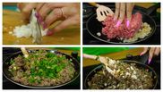Haideți să trecem la treabă, să vedem cum se prepară acest fel de mâncare. O să preparăm această tortila în tigaie. Curățăm o ceapă, tăiem ceapa mărunțel, acum o să pun carnea și ceapa verde. Un mic truc pe care o să-l folosim este o farfurie perfectă și pentru că nu aruncăm nimic, aici o să tăiem fâșii, fâșii și o să le adăugăm în compoziția de carne ca să o îngroașe.