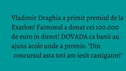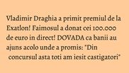 Vladimir Draghia a ridicat astazi premiul pentru care a muncit mai bine de cinci luni la Exatlon. Insa, asa cum a promis, nu a tinut prea mult in mana cecul de 100.000 de euro. Draghia a donat banii asociatiei MagiCAMP, iar acest lucru la intamplat, in direct, la WOWbiz.