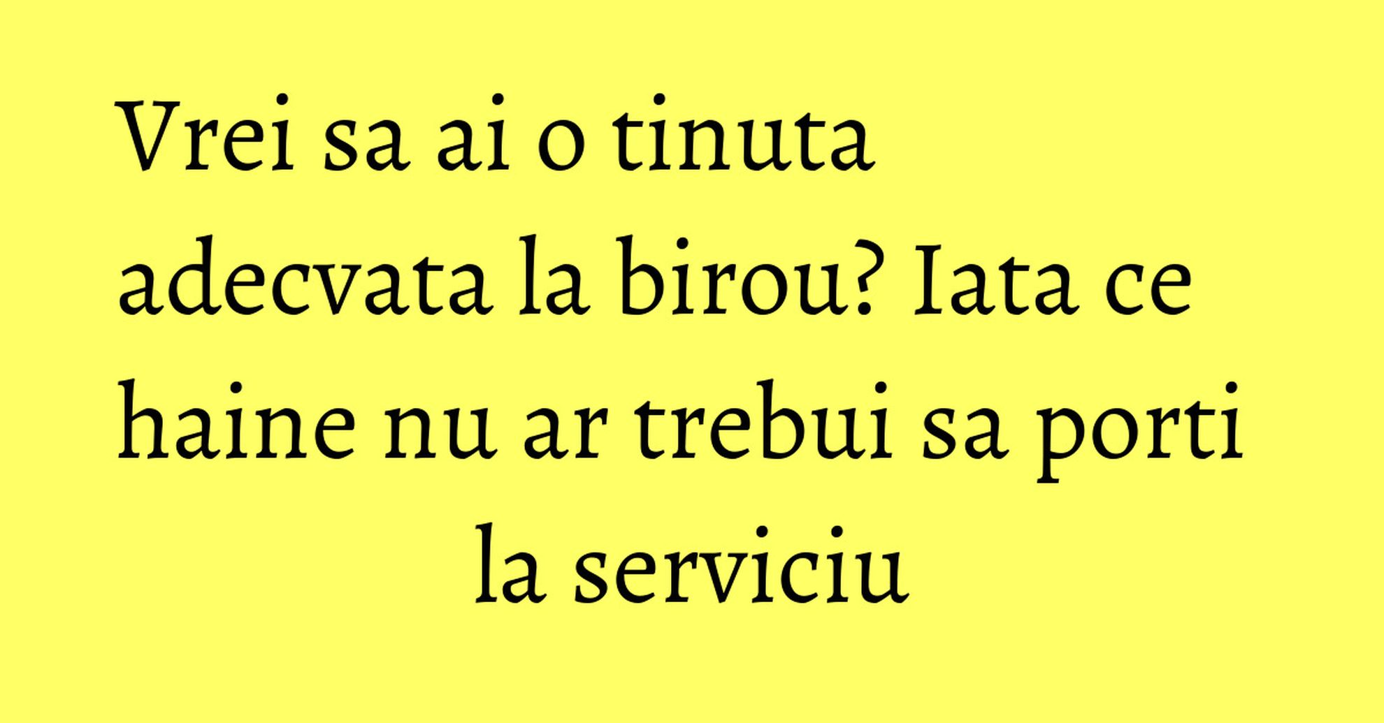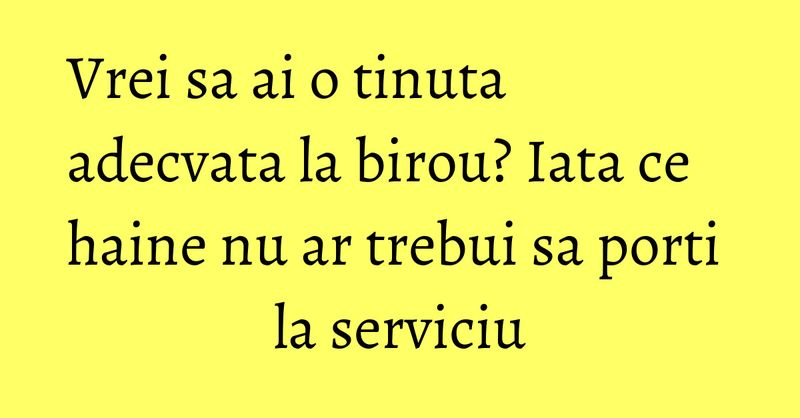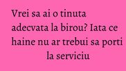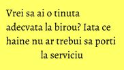 Modul in care te imbraci si in care te prezenti la serviciu este extrem de relevant, putand sa-ti influenteze negativ relatiile cu colegii sau clientii, ori dimpotriva, sa constituie un punct forte in construirea carierei tale. Iata cateva sfaturi despre ceea ce nu ar trebui sa porti la serviciu.