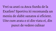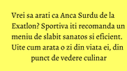 In cadrul interviului, Anca Surdu de la Exatlon le-a spus jurnalistilor de la slabsaugras.ro si cum arata o zi din viata ei, din punct de vedere culinar.